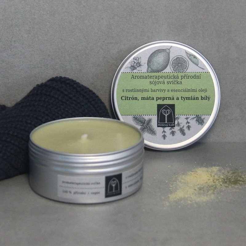 Aromaterapeutická sójová svíčka Citrón, máta peprná a tymián bílý 145 gskladem 6 ks249,00 Kč/ ks205,79 Kč bez DPH