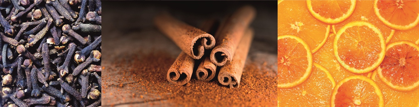 Obsažené esenciální oleje: hřebíček, skořice (list i kůra), pomeranč a borovice jako fixátor vonné kompozice
