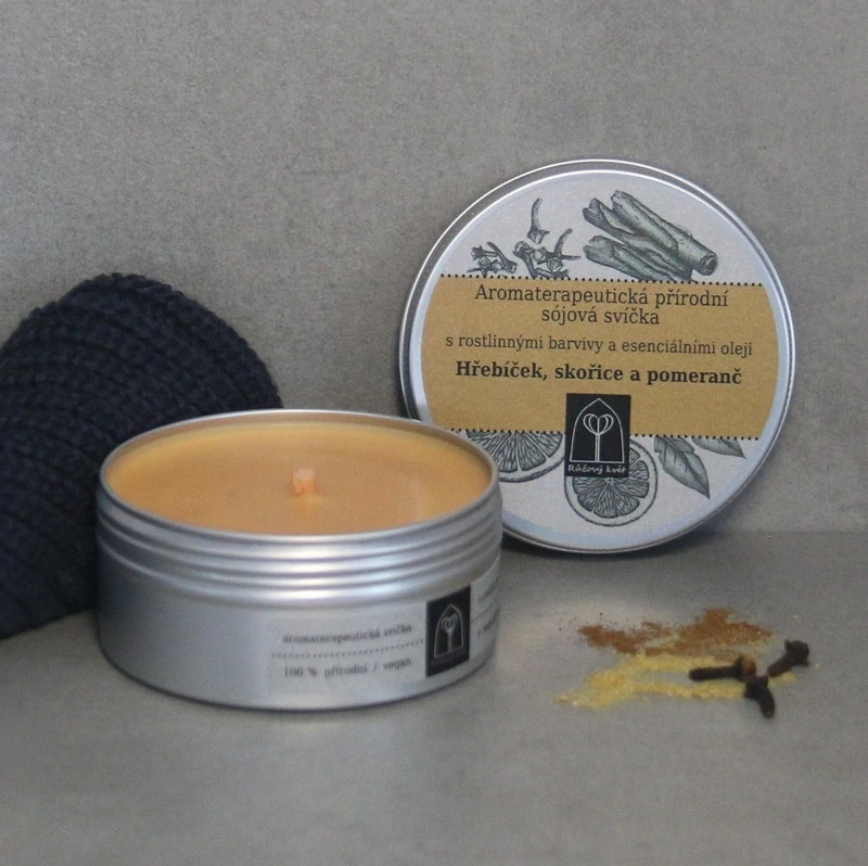 Aromaterapeutická sójová svíčka Hřebíček, skořice a pomeranč 145 gskladem > 10 ks249,00 Kč/ ks205,79 Kč bez DPH