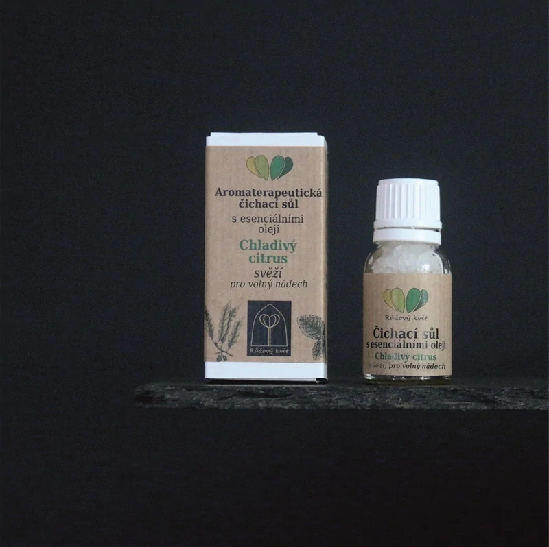 Aromaterapeutická čichací sůl Chladivý citrus - svěží, pro volný nádech, obsahující směs chladivých a citrusových esenciálních olejů - rýmovník, eukalyptus, jedli, litseu cubebu a tymián.