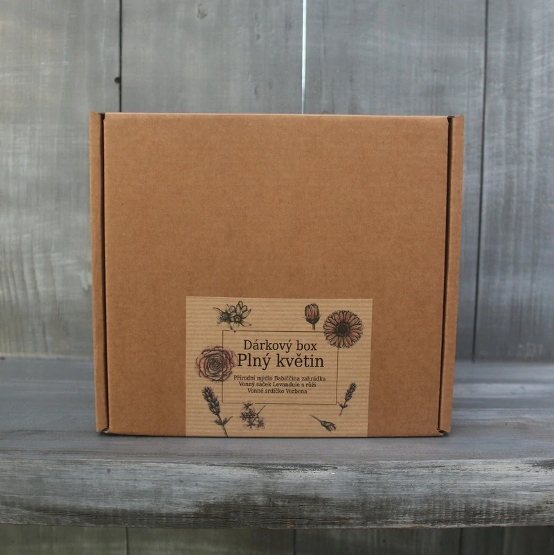 Dárkový box Plný květin obsahuje přírodní olejové mýdlo Babiččina zahrádka, přírodní vonné voskové srdíčko Verbena a vonný sáček Levandule s růží. Krabička je vyplněná dřevitou vlnou a opatřená ozdobnou etiketou.